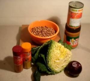 Set the beans aside when they are almost cooked, covered or use another pan to sauté the chopped onion in oil for a short while, add the cabbage or sauté them together. Then add tomatoes